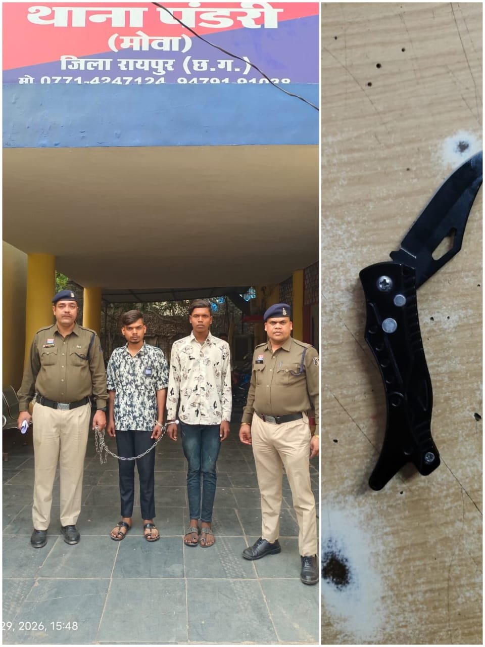 CG Crime News : पुलिस कमिश्नरेट रायपुर द्वारा असामाजिक तत्वों एवं अपराधियों के विरूद्ध लगातार सख्त कार्यवाही की जा रही है।इसी क्रम में दिनांक 28.1.2026 को एण्टी क्राईम एण्ड साइबर यूनिट रायपुर तथा थाना पण्डरी पुलिस की संयुक्त टीम द्वारा थाना पंडरी क्षेत्र में अलग-अलग स्थानों से प्राप्त सूचना के आधार पर अवैध रूप से धारदार चाकू लेकर घूम रहे 2 आरोपियों को गिरफ्तार कर उनके कब्जे से चाकू जप्त किए गए।