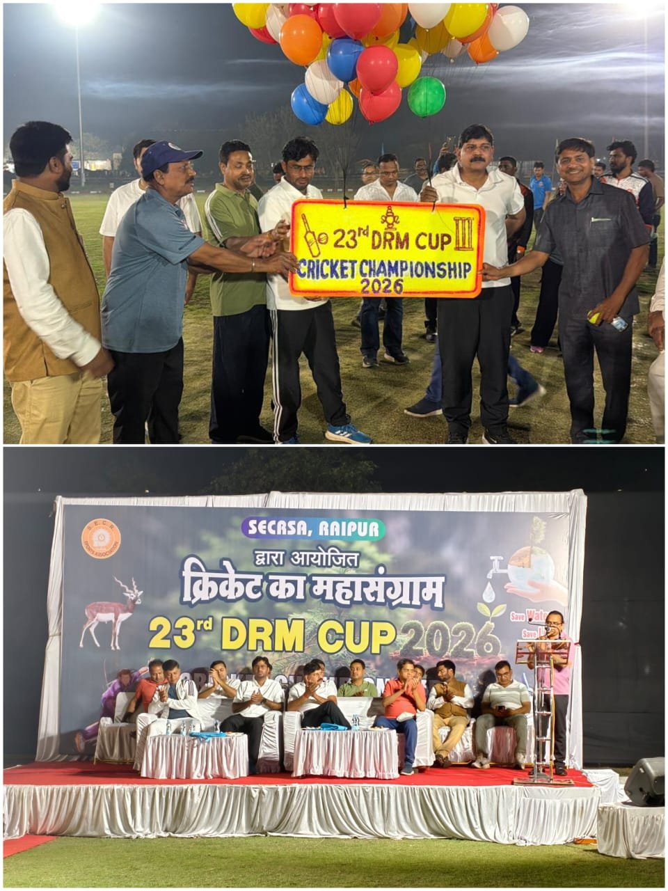 Raipur Khel News | दक्षिण पूर्व मध्य रेल खेल संघ, रायपुर द्वारा आयोजित 23वाँ डीआरएम कप क्रिकेट चैम्पियनशिप (23वाँ DRM CUP CRICKET CHAMPIONSHIP – 2026) का भव्य शुभारंभ समारोह दिनांक 21 फरवरी 2026 को सायं 18:30 बजे सेकरसा मैदान, डब्ल्यूआरएस कॉलोनी रायपुर में उत्साह एवं गरिमा के साथ शुरू हुआ। कार्यक्रम का शुभारंभ माननीय मंडल रेल प्रबंधक महोदय श्री दयानंद जी के मुख्य आतिथ्य में हुआ। वरिष्ठ क्रीड़ा अधिकारी एवं वरिष्ठ मंडल कार्मिक अधिकारी श्री राहुल गर्ग के शानदार रंगारंग आयोजन ने एक बार फिर उसके कुशल मार्गदर्शन और नेतृत्व का परिचय दिया। अपने स्वागत भाषण में उन्होंने बताया कि इस वर्ष प्रतियोगिता का शुभंकर “काला हिरण” रखा गया है जल बचाओ जीवन बचाओ नारे के द्वारा सामाजिक संदेश और छत्तीसगढ़ में काले हिरण के पुनरुद्धार की रणनीति को दर्शकों ने बताया जो कि पर्यावरण संरक्षण एवं जैव विविधता का प्रतीक है इसके अलावा इस आयोजन के माध्यम से जीवन में खेलों के महत्व को रेखांकित करने के साथ-साथ पर्यावरण एवं जल संरक्षण के प्रति जागरूकता का संदेश प्रदान गया।