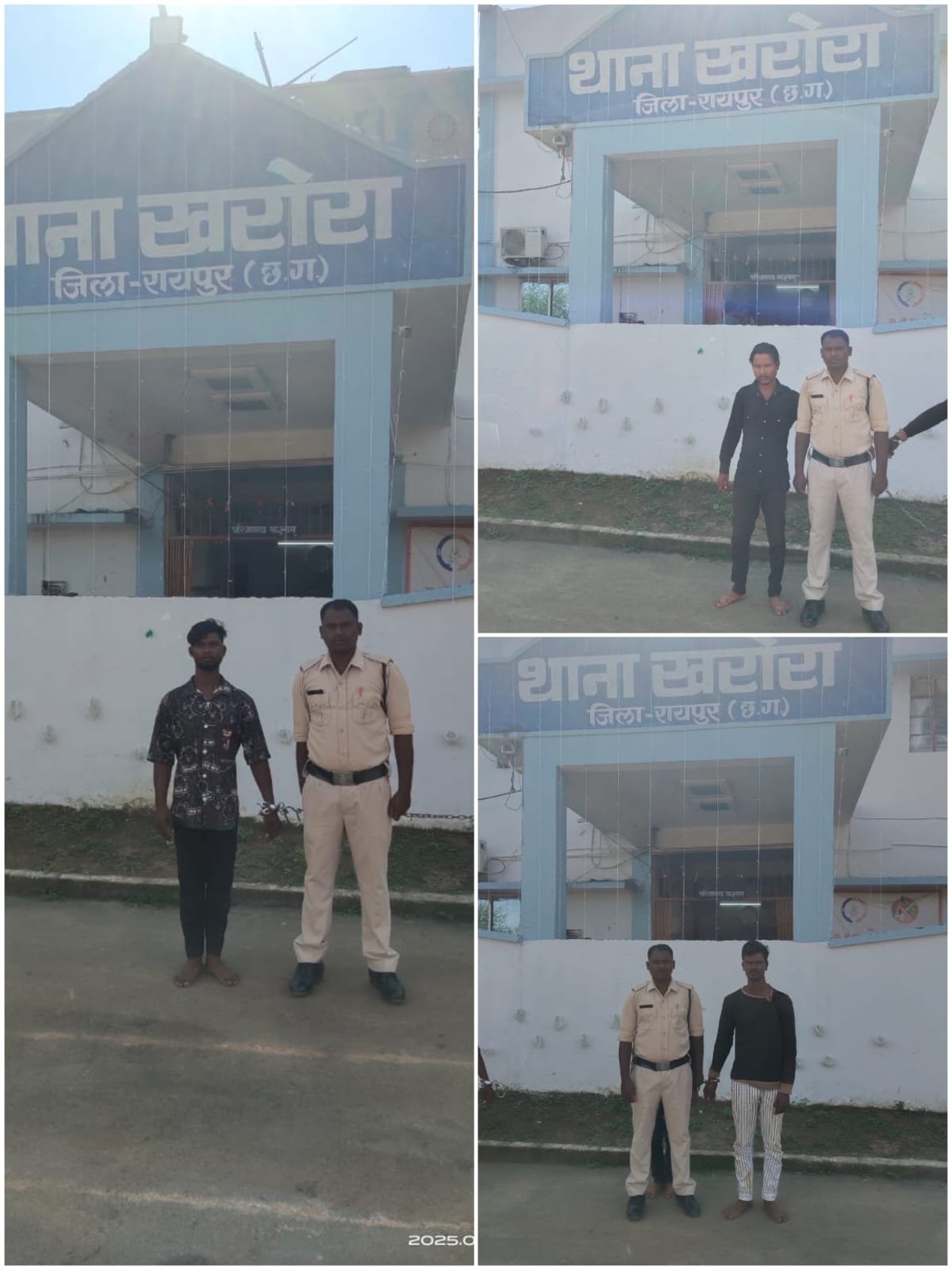 इस प्रकार है कि आज दिनांक 29/08/2025 को सरप्राईज चेकिंग दौरान जरिये मुखबीर द्वारा मोबाईल से सूचना मिला कि 02 व्यक्ति नया बस स्टैण्ड खरोरा के सामने बाजार तरफ चाकू लेकर घुम रहा है कि सूचना तस्दीक हेतु थाना खरोरा पुलिस पार्टी मुखबीर द्वारा बताये स्थान पर घेराबंदी कर आरोपी किशन सांवरा एवं गोलू सांवरा को अवैध रूप से लोहे के पट्टी से बनी हुई चाकू रखे हुए रंगे हाथ पकड़े गये एवं आरोपी महेश गोड़ को ग्राम बेलटुकरी में आम जगह पर चाकू रखकर आने जाने लोगों को डराते धमकाते पाये जाने पर आरोपियों को चाकू रखने के संबंध में कागजात पेश करने नोटिस दिया गया जो कोई कागजात पेश नहीं करने पर आरोपियों के कब्जे से लोहे के चाकू पृथक पृथक गवाहो के समक्ष जप्त कर कब्जा पुलिस लिया गया। आरोपियों के विरूध्द अपराध घटित करना पर्याप्त साक्ष्य पाये जाने से मौके पर विधिवत् गिरफ्तार कर गिरफ्तारी की सूचना परिजनों को देकर पृथक-पृथक न्यायिक रिमाण्ड पर माननीय न्यायालय के समक्ष प्रस्तुत किया गया है।