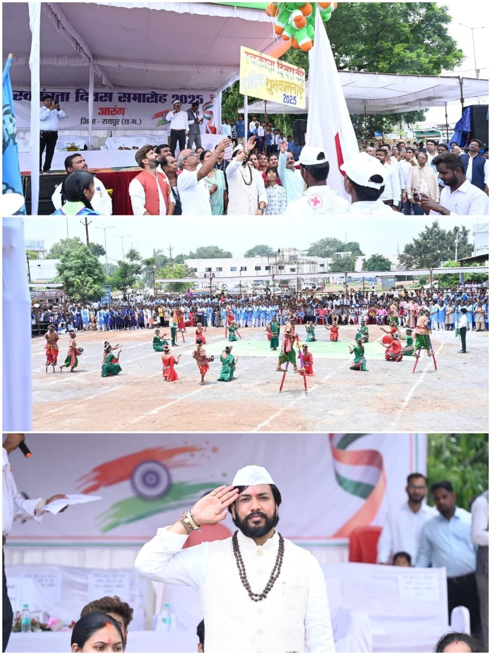 आरंग – स्वतंत्रता दिवस के पावन अवसर पर आरंग हाईस्कूल मैदान में आयोजित मुख्य समारोह में गुरु खुशवंत साहेब जी ने ध्वजारोहण कर परेड की सलामी ली। इस दौरान आरंग की शान बढ़ाने वाले उत्कृष्ट छात्र–छात्राओं को मंच पर सम्मानित करते हुए उन्होंने उनके उज्ज्वल भविष्य की शुभकामनाएं दीं। समारोह में प्रस्तुत देशभक्ति से ओत–प्रोत पंथी, कर्मा, सुवा, आदिवासी नृत्य सहित विभिन्न सांस्कृतिक कार्यक्रमों ने उपस्थित जनमानस को मंत्रमुग्ध कर दिया।