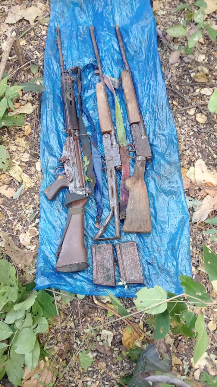 • सर्चिंग के दौरान टेकरी के ऊपर चट्टान के किनारे नक्सलियों द्वारा डम्प कर छुपाए गए 01 नग AK-47 एवं 01 नग 12 बोर हथियार बरामद किए गए।