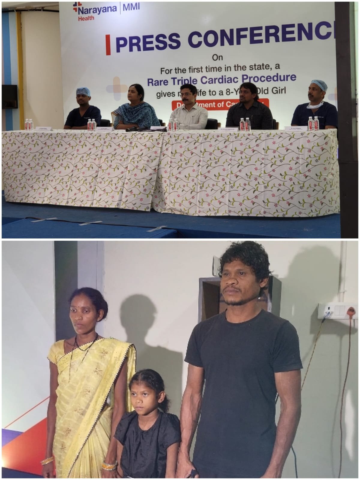 रायपुर एमएमआई नारायणा हॉस्पिटल की चिकित्सा टीम ने एक उल्लेखनीय उपलब्धि हासिल करते हुए 8 वर्षीय बच्ची पर एक जटिल और दुर्लभ ट्रिपल इंटरवेंशनल कार्डियक प्रक्रिया सफलतापूर्वक पूरी की है। यह छत्तीसगढ़ एवं मथ्य भारत का पहला मामला माना जा रहा है। मात्र 18 किलोग्राम वजन वाली इस बच्ची की पहचान अस्पताल द्वारा आयोजित एक स्वास्थ्य शिविर के दौरान हुई थी, जिसके बाद उसे विस्तृत जांच के लिए अस्पताल लाया गया। जांच के दौरान पाया गया कि बच्ची गंभीर पल्मोनरी स्टेनोसिस से पीड़ित थी, जिसमें हृदय से फेफड़ों तक रक्त ले जाने वाला वाल्व अत्यधिक संकरा हो गया था। इसके अलावा, उसे एट्रियल सेप्टल डिफेक्ट (ASD) था, जो हृदय के ऊपरी कक्षों के बीच एक बड़ा छेद होता है, साथ ही जन्मजात कम्प्लीट हार्ट ब्लॉक (CHB) भी था, जिसके कारण हृदय की धड़कन असामान्य रूप से धीमी हो गई थी।