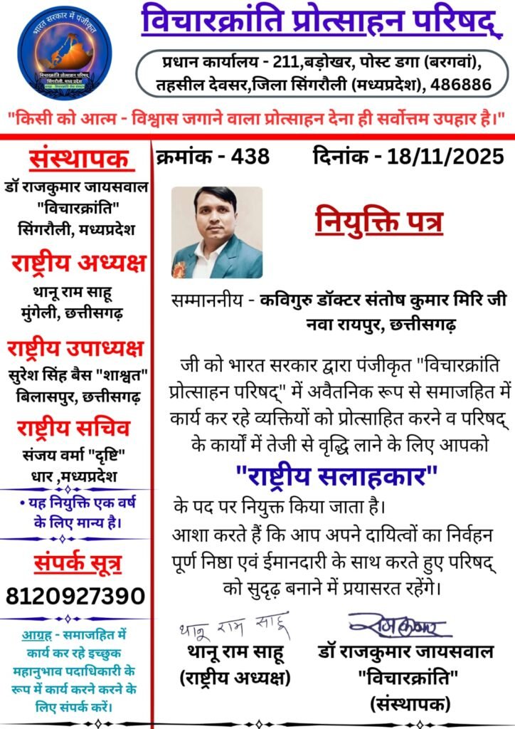 Desk News | भारत सरकार द्वारा पंजीकृत विचारक्रांति प्रोत्साहन परिषद् के संस्थापक डॉ राजकुमार जायसवाल “विचारक्रांति” ने रायपुर जिले के कविगुरु डॉक्टर संतोष कुमार मिरी जी को राष्ट्रीय सलाहकार पद की जिम्मेदारी सौंपी।