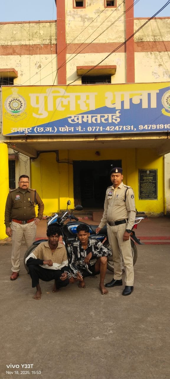 CG CRIME NEWS : प्रार्थी तेजराम वर्मा निवासी देवरी अकोली धरसींवा रायपुर ने थाना खमतराई रायपुर में रिपोर्ट दर्ज कराया कि दिनांक 16.11.2025 को अपने नया मोटर सायकल हीरो होण्डा स्पेलेण्डर प्लस जिसका इंजन नम्बर HA11E8RC07081 एवं चेचिस नम्बर MBLHAW234R9C05861 मॉडल 2025 काला नीला रंग को दोपहर करीबन 2.00 बजे रावांभाठा ट्रांसपोर्ट नगर स्थित स्वास्थ्य केन्द्र के पास खड़ी कर सामान लेने दुकान गया था, जिसे वापस आकर देखने पर खड़ी किये स्थान में मोटर सायकल नही था, जिसे आसपास पता तलाश करने पर नही मिला, मोटर सायकल को कोई अज्ञात चोर द्वारा चोरी कर ले जाने कि रिपोर्ट पर थाना खमतराई में अपराध कमांक 1187/2025 धारा-303 (2) बीएनएस दर्ज कर विवेचना में लिया गया था। विवेचना दौरान मूखबीर से सूचना मिला कि एक बिना नम्बर प्लेट की मोटर सायकल को दो लड़के भनपुरी तिराहा के पास चलाते हुए वहीं पर स्थित पान ठेले के पास खड़ी रूके हुए है कि सूचना पर तत्काल खमतराई पुलिस मौके पर पहुंचकर घेराबंदी कर 02 लड़के को पकड़कर उनके पास रखे मोटर सायकल के दस्तावेज के संबंध में पूछताछ करने पर उनके द्वारा संतोषप्रद जवाब नहीं दिया गया, लड़को से कड़ाई से पूछताछ करने एक लड़का अपना नाम हिमांशु वर्मा बताया जिन्होंने बताया कि अपने साथी बलराम यादव के साथ मिलकर ट्रांसपोर्ट नगर रावांभाठा से उक्त मोटर सायकल को चोरी करना बताये। आरोपियों द्वारा अपराध कबूल करने से आरोपियों के विरूद्ध अपराध साक्ष्य पाये जाने से उन्हें विधिवत गिरफ्तार कर न्यायिक रिमाण्ड पर भेजा गया।
