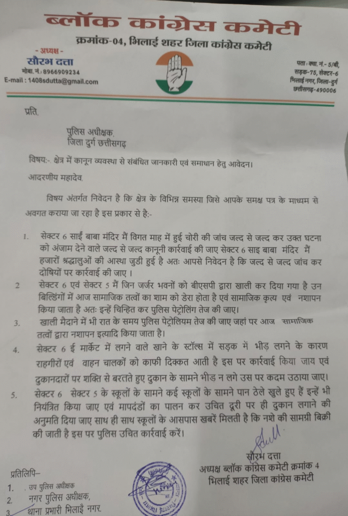 भिलाई शहर जिला कांग्रेस कमेटी ब्लॉक क्रमांक 4 का प्रतिनिधि मंडल भिलाई नगर टाउनशिप क्षेत्र सेक्टर 6 एवं सेक्टर 5 से जुड़े विभिन्न जनहित की समस्याओं को लेकर कोतवाली थाना भिलाई नगर थाना प्रभारी जितेंद्र वर्मा से मिलकर पुलिस अधीक्षक दुर्ग विजय अग्रवाल के नाम ज्ञापन के माध्यम से समस्याओं से अवगत कराया। प्रतिनिधि मंडल में उपस्थित ब्लॉक कांग्रेस के प्राधिकारी एवं जनप्रतिनिधियों ने अपना क्षेत्र से जुड़ी समस्याओं पर चर्चा की।ब्लॉक कांग्रेस कमेटी अध्यक्ष सौरभ दत्ता ने मांग किया कि सेक्टर 6 साईं बाबा मंदिर मैं विगत माह में हुई चोरी जिस्म की लाखों रुपए के आभूषण एवं अन्य पूजा संबंधित आवश्यक वस्तुएं चोरी हुई थी उक्त मामले की जांच जल्द से जल्द कर उक्त घटना को अंजाम देने वाले जल्द से जल्द कानूनी कार्रवाई की जाए सेक्टर 6 साइ बाबा मंदिर मैं हजारों श्रद्धालुओं की आस्था जुडी हुई है एवं घटना को हुए काफी समय हो गया।