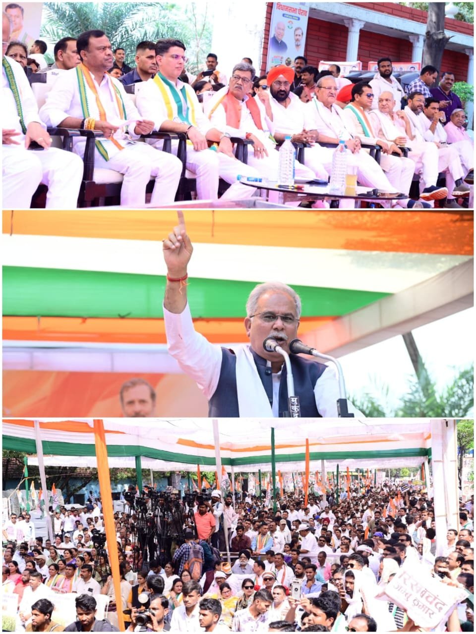 राष्ट्रीय महासचिव एवं छत्तीसगढ़ प्रभारी सचिन पायलट ने सभा को संबोधित करते हुए कहा कि गरीबों, मजदूरों को वंचित, जो असहाय है, निर्बल है उन लोगों की आवाज बन कर राजधानी में विधानसभा के घेराव का निर्णय लिया है। छत्तीसगढ़ सहित पूरे देश में कांग्रेस पार्टी ने जनता की आवाज को उठाने का बीड़ा उठाया है। आपके साथ मिलकर इस सरकार को जगाना जरूरी है कि प्रमुख रूप से नरेगा का कानून बना था ये बड़ा और विचित्र कानून था जो पूरे दुनिया में किसी मुल्क में नहीं था। रोजगार का अधिकार सोनिया गांधी जी ने डॉ. मनमोहन सिंह जी ने दिया। मोदी जी प्रधानमंत्री बने उनका पहला भाषण मनरेगा के खिलाफ था। उनकी मंशा 2014 में इस नरेगा को बंद करने की थी। तीसरी बार सरकार बनने के बाद मोदी सरकार इस कानून में बदलाव करना चाहती है, वो बंद करना चाहती है। पहले केंद्र सरकार नरेगा का 90 प्रतिशत पैसा दिल्ली से आता था। अब इन्होंने राज्यों पर 60-40 का रेस्यों डाल दिया। जो कार्यक्रम होंगे खेत, खलिहान, कुएं, तालाब निर्माण वो निर्णय ग्राम पंचायत नहीं कर सकती वो सब केन्द्रित कर दिया। भाजपा की सरकार समझ गयी कि देश की जनता का कितना भी शोषण कर लो, कितना भी अत्याचार कर लो, कितना भी कानून बदल लो, ये धर्म की आड़ में, हिन्दू-मुसलमान की आड़ में, मंदिर-मस्जिद की आड़ में दोबारा फूल छाप पर ही वोट डालेंगे। इस सरकार को गलतफहमी हो गयी है। देश में बहुत सारे प्रधानमंत्री हुये लेकिन किसी प्रधानमंत्री ने 75 सालों में देश के किसानों के साथ धोखा नहीं किया है। हमारी नीतियां अलग हो सकती है, विचारधारा अलग हो सकती है। किसी सरकार ने किसी प्रधानमंत्री किसानों के साथ धोखा नहीं किया। पहली बार ऐसी सरकार जो दिल्ली में बैठी है जो दबाव में निर्णय लिये जा रहे है। किसानों से धोखा कर रहे है। इस देश के किसानों के हित को दरकिनार करके अमेरिका के साथ समझौता किया है। जो ऐसी सरकार नहीं बनी है जो विदेशी ताकतों के सामने घुटने टेक दे। दूसरे देश के मुल्क किसी भी देश की ताकतों को नहीं रोक सकता है। डोनाल्ड ट्रंप अमेरिका में बैठे-बैठे युद्ध की घोषणा कर देते है। जिन मुल्कों के साथ हमारी समझौता हुआ है आज खाड़ी में हमारे 95 लाख भारतीय रहते है। उनकी सुरक्षा के लिए क्या किया? आज देश में कानून बनते है वो पक्षपात कानून बनते है। नोटबंदी लेकर आए लोगों को लाइन लगा दिया। फिर गैस के लिए लोगों को लाइन लगा दिया। आज के हालात पैदा करती रही, देशों सिर्फ पूंजीपतियों की तूती बोल रही है। भाजपा सरकार को गरीब, किसान, महिला से कोई सरोकार नहीं। इसके खिलाफ पूरे देश में कांग्रेस पार्टी राहुल गांधी जी के नेतृत्व में जनता की आवाज बुलंद कर रही हैं। भाजपा सरकार को सवा दो साल हो गए सरकार की नाक के नीचे अफीम की खेती होती है। आपने उजागर कर 